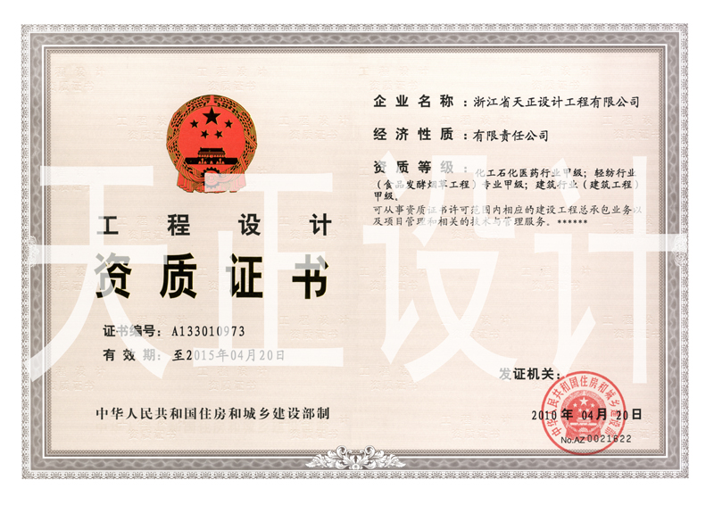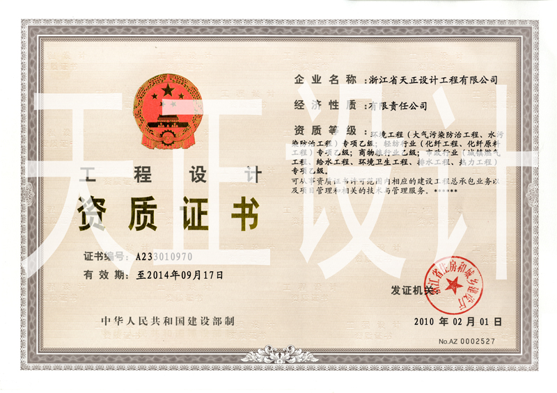 經(jīng)省建設(shè)廳、國家建設(shè)部審查核準(zhǔn),我司順利通過工程勘察設(shè)計資質(zhì)換證,保留了原有甲、乙級工程設(shè)計資質(zhì)中的業(yè)務(wù)范圍。新的工程設(shè)計資質(zhì)范圍為:化工石化醫(yī)藥行業(yè)甲級、輕紡行業(yè)(食品發(fā)酵煙草工程)專業(yè)甲級、建筑行業(yè)(建筑工程)甲級;環(huán)境工程(大氣污染防治工程、水污染防治工程)專項乙級、輕紡行業(yè)(化纖工程、化纖原料工程)專項乙級、商物糧行業(yè)乙級、市政行業(yè)(城鎮(zhèn)燃?xì)夤こ?、給水工程、環(huán)境衛(wèi)生工程、排水工程、熱力工程)專項乙級??蓮氖沦Y質(zhì)證書許可范圍內(nèi)相應(yīng)的建設(shè)工程總承包業(yè)務(wù)以及項目管理和相關(guān)的技術(shù)與管理服務(wù)。
